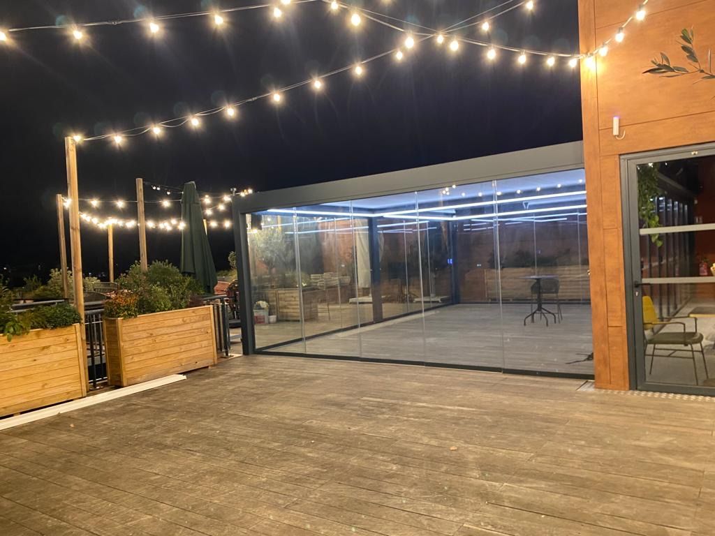Pose d'une pergola bioclimatique connectée avec baies vitrées par AB Travaux & Sagnes Aménagement.